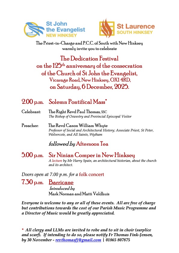 To celebrate the 125th anniversary of the concecration of the Church of St John the Evangelist. Vicarage Road, New Hinksey OX1 4RD