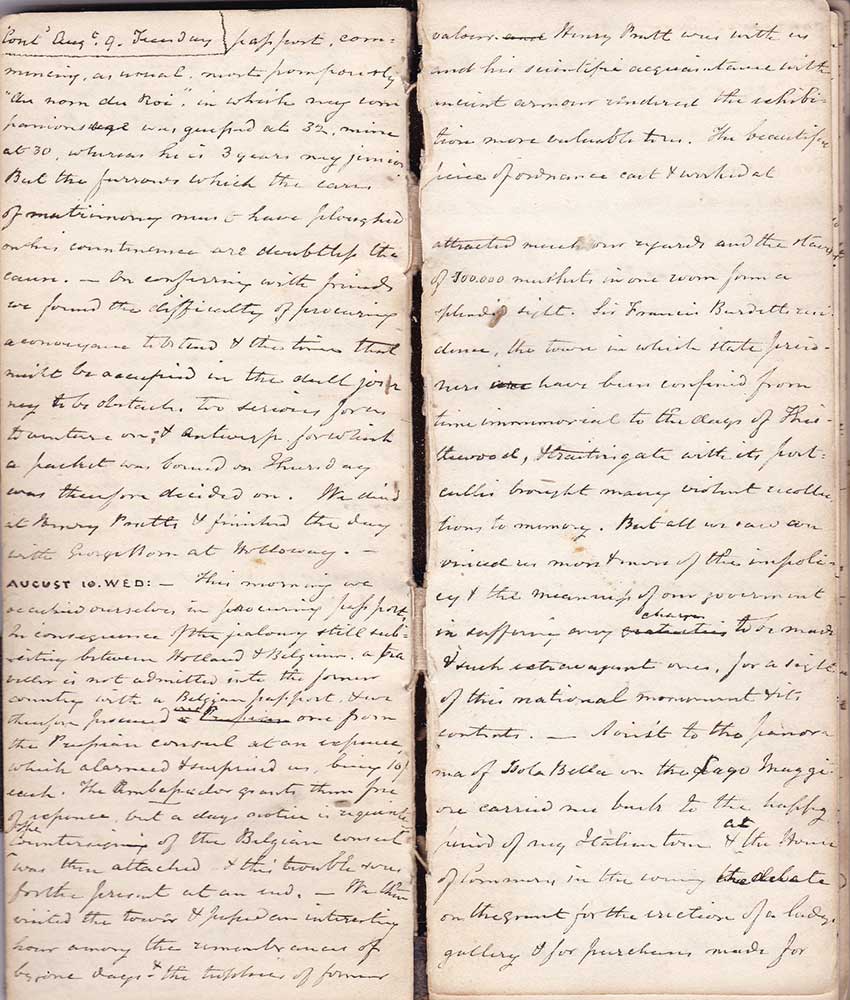 AUG. 11. THURS: – At half past 11 we stepped on board the magnificent steam packet Soho & until it started 3/4 of an hour afterwards, the arrival of passengers, especially the later ones afforded some ludicrous scenes. Why will people subject themselves to the inconvenience & uncertainty of being half an hour later than they ought to be. A cause for it may perhaps be found in an observation I made that the latest arrivals had generally some ladies among them & the last of all was a lady solus. Poor thing she had no one to hurry or scold her as others seemed to have. Her thick quilted gown proclaimed her to be a dutchwoman, but to her praise be it said, that although clothed in a garment of heat she bore herself with as much coolness & placidity as though she had experienced no chance of the loss of her passage. I soon discovered the difficulty of travelling to any place incognito, even if I wished it, for here were 5 on board who immediately recognised me, viz. Profrs Borrer & Obre of Oriel, W.F. Wingfield of Ch Ch, Woodgate & Brown of St Johns. They were very friendly & chatty throughout the voyage: the other passengers seemed to be about 80 in number & many of them cultivated our acquaintance & appeared pleasant fellows. The Rhine formed the principal topic of conversation & points of destination & there were few others than English. The voyage down the Thames was much as usual & so was the scrumbling dinner where as at most public ones there is little difficulty in procuring what you do not want but much in what you do. The pitching of the vessel sent me down to my berth before 8 o’clock & in the interval between 8 on the following morning I slept soundly. I had felt a little qualmish before going below and hesitated whether I shd give