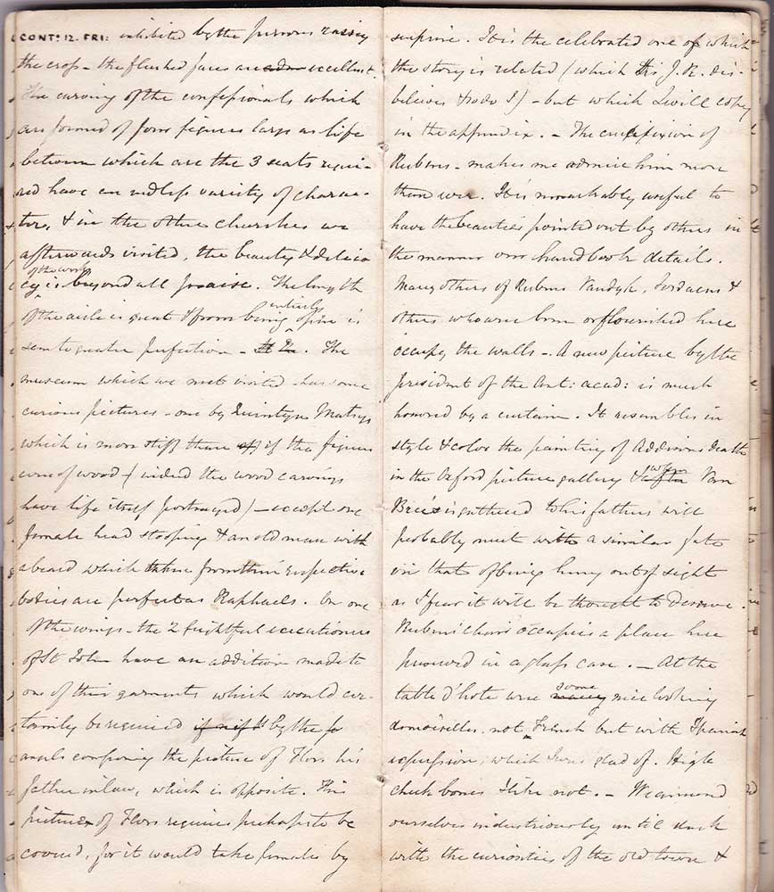 A new picture by the president of the Ant: acad: is much honored by a curtain. It resembles in style and color the painting of Addisons death in the Oxford picture gallery & when Van Bree is gathered to his fathers will probably meet with a similar fate in that of being hung out of sight as I fear it will be thought to deserve. Rubens' chair occupies a place here preserved in a glass case. – At the table d’hote were some nice looking demoiselles, not French but with Spanish expression, which I was glad of. High cheekbones I like not. – We amused ourselves industriously until dark with the curiosities of the old town &
