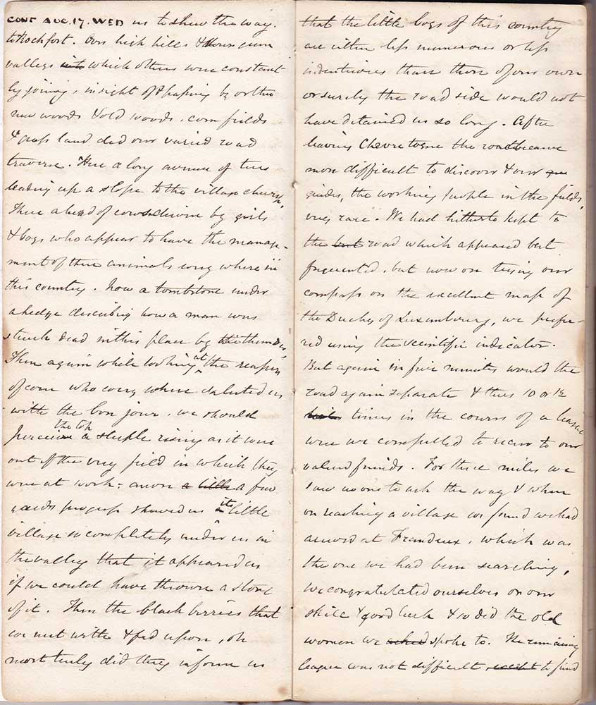 us to show the way to Rochfort. Over high hills & across green valleys which others were constantly joining, in sight of & passing by or through new woods & old woods, cornfields & grass land did our varied road traverse. Here a long avenue of trees leading up a slope to the village church. There a herd of cows driven by girls & boys who appear to have the management of these animals every where in this country. Now a tombstone under a hedge describing how a man was struck dead in this place by the thunder. Then again while looking at the reapers of corn who every where saluted us with the bon jour, we should perceive the top [of] a steeple rising as it were out of the very field in which they were at work; anon a few yards progress showed us its little village so completely under us in the valley that it appeared as if we could have thrown a stone of it. Then the black berries that we met with & fed upon, oh, most truly did they inform us that the little boys of this country are either less numerous or less industrious than those of our own or surely the roadside would not have detained us so long. After leaving Chevretogne the road became more difficult to discover & our guides, the working people in the fields, very rare. We had hitherto kept to the road which appeared best frequented but now on trying our compass on the excellent map of the Duchy of Luxembourg, we preferred using the scientific indicator. But again in five minutes would the road again separate & thus 10 or 12 times in the course of a league were we compelled to recur to our valued friends. For three miles we saw no one to ask the way & when on reaching a village we found we had arrived at Frandeux, which was the one we had been searching, we congratulated ourselves on our skill & good luck & so did the old women we spoke to. The remaining league was not difficult to find