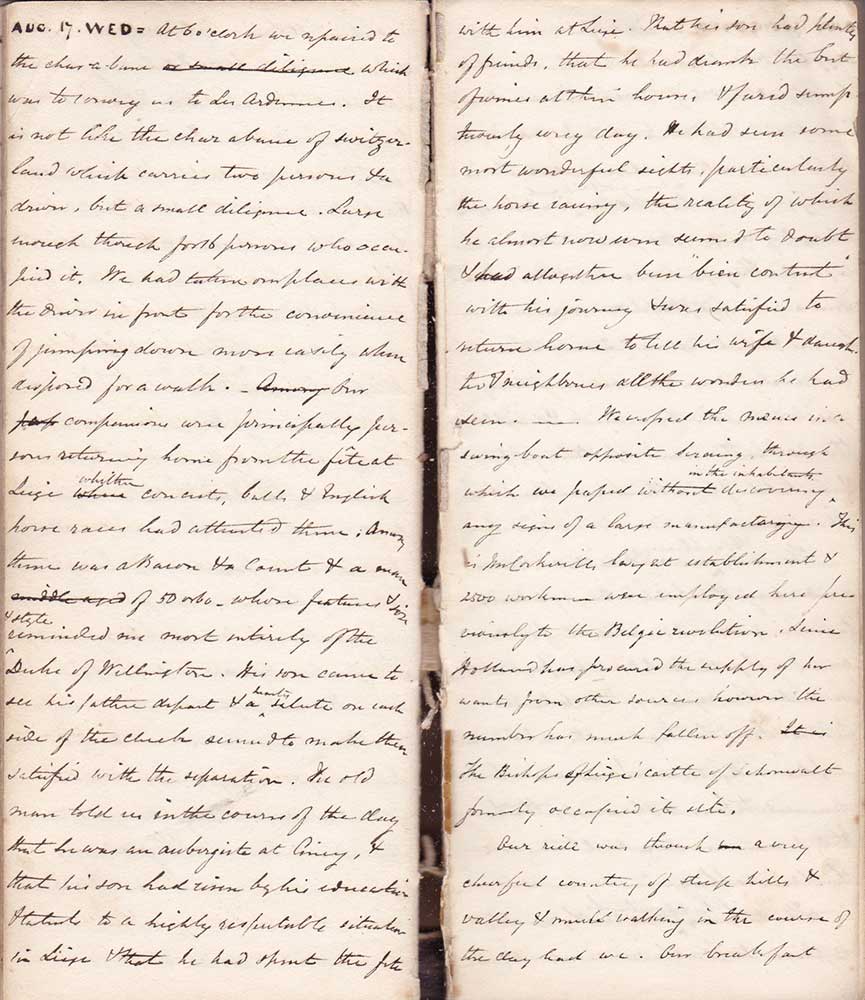 - At six o'clock we repaired to the char-a-banc which was to convey us to Les Ardennes. It is not like the char-a-banc of Switzerland which carries two persons & a driver, but a small diligence. Large enough though for 16 persons who occupied it. We had taken our places with the driver in front for the convenience of jumping down more easily when disposed for a walk. Our companions were principally persons returning home from the fête at Liège whither concerts, balls & English horse races had attracted them; Among them was a Baron & a Count & a man of 50 or 60 whose features & size & style reminded me most entirely of the Duke of Wellington. His son came to see his father depart & a hearty salute on each side of the cheek seemed to make them satisfied with the separation. The old man told us in the course of the day that he was an aubergiste at Ciney & that his son had risen by his education & talents to a highly respectable situation in Liège & that he had spent the fête with him at Liège. That his son had plenty of friends, that he had drunk the best of wines at their houses & fared sumptuously every day. He had seen some most wonderful sights, particularly the horse racing, the reality of which he almost now even seemed to doubt & had altogether been "bien content" with his journey & was satisfied to return home to tell his wife & daughter & neighbours all the wonders he had seen. ~~~ We crossed the Meuse in a rowing boat opposite Seraing through which we passed without discovering in the inhabitants any signs of a large manufactory. This is Mr Cockerill's largest establishment & 2500 workmen were employed here previously to the Belgic revolution. Since Holland has procured the supply of her wants from other sources however the number has much fallen off. The Bishop of Liege's castle of Schonwalt formerly occupied its site.
