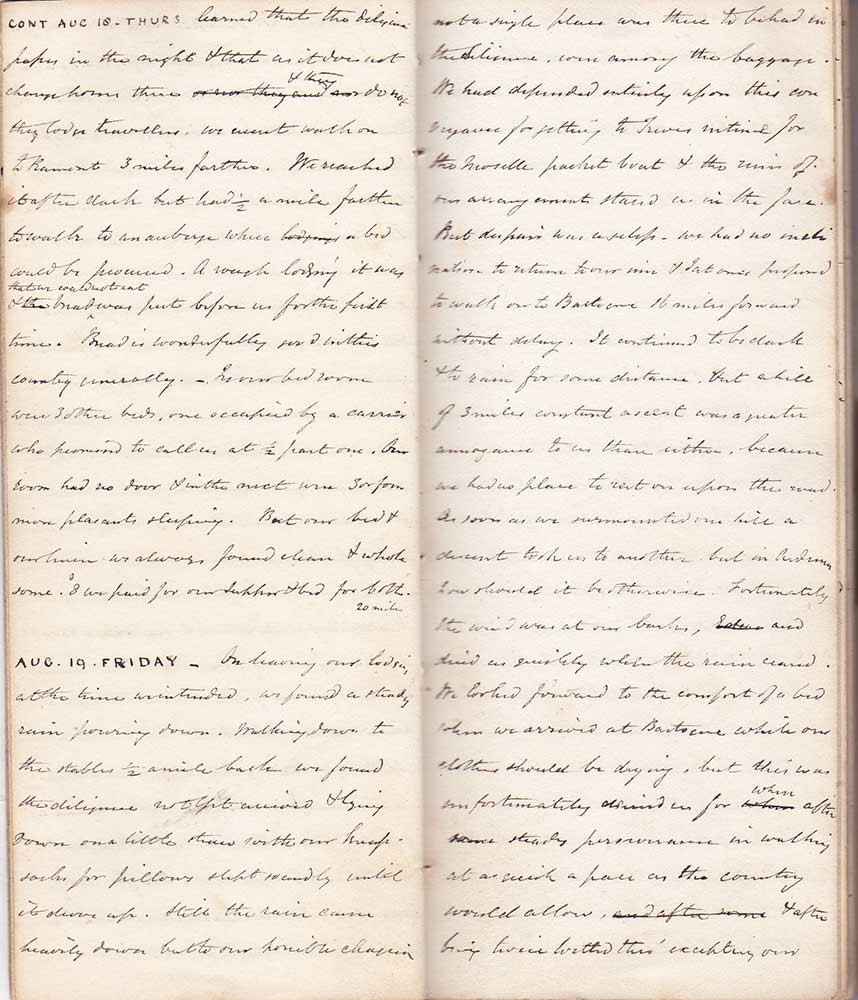 AUG. 19. FRIDAY - On leaving our lodging at the time intended, we found a steady rain pouring down. Walking down to the stables 1/2 mile back we found the diligence not yet arrived & lying down on a little straw with our knapsacks for pillows slept soundly until it drove up. Still the rain came heavily down but to our horrible chagrin not a single place was there to be had in the diligence, even among the baggage. We had depended entirely upon this conveyance for getting to Treves in time for the Moselle packet boat & the ruin of our arrangements stared us in the face. But despair was useless, we had no inclination to return to our inn & I at once proposed to walk on to Bastogne 16 miles forward without delay. It continued to be dark & to rain for some distance, but a hill of 3 miles constant ascent was a matter of greater annoyance to us than either, because we had no place to rest on upon the road. As soon as we surmounted one hill a descent took us to another but in Ardennes how should it be otherwise. Fortunately the wind was at our backs and dried us quickly when the rain ceased. We looked forward to the comfort of a bed when we arrived at Bastogne while our clothes should be drying, but this was unfortunately denied us for when after some steady perseverance in walking at as quick a pace as the country would allow & after being twice wetted through excepting our
