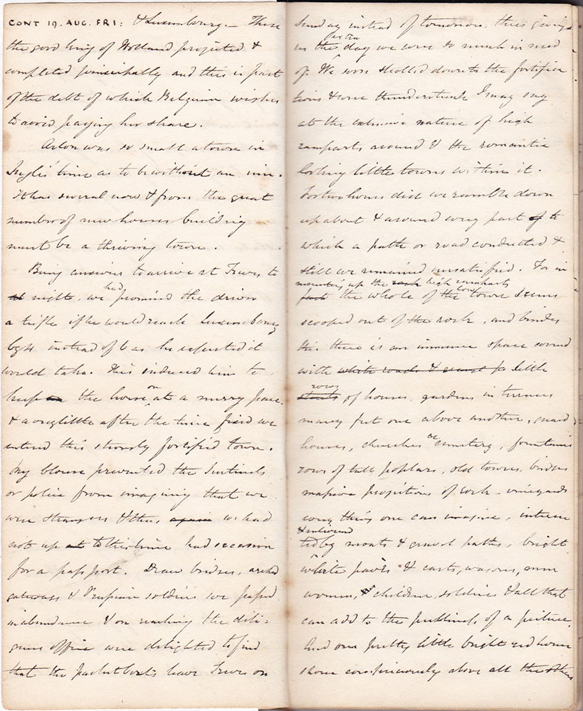 Being anxious to arrive at Treves tonight we had promised the driver a trifle if he would reach Luxembourg by 4 instead of 6 as he expected it would take. This induced him to keep the horse on at a merry pace & a very little after the time fixed we entered this strongly fortified town. My blouse prevented the sentinels or police from imagining that we were strangers & thus we had not up to this time had occasion for a passport. Draw bridges, arched gateways & Prussian soldiers we passed in abundance & on reaching the diligence office were delighted to find that the packet boats leave Treves on Sunday instead of tomorrow thus giving the extra day we were so much in need of. We soon strolled down to the fortifications & were thunderstruck I may say at the extensive nature of high ramparts around & the romantic looking little towers within it. For two hours did we ramble down up about & around every part to which a path or road conducted & still we remained unsatisfied. For in mounting up the high ramparts the whole of the low town seems scooped out of the rock, and besides this there is an immense space around with rows of houses, gardens in terraces many put one above another, guard houses, churches a cemetery, fountains rows of tall poplars, old towers, bridges, massive projections of rock - vineyards everything one can imagine, intersected & enlivened by moats & gravel paths, bright white pavés & carts, wagons, some women, children, soldiers, & all that can add to the prettiness of a picture. And one pretty little bright red house shone conspicuously above all the others