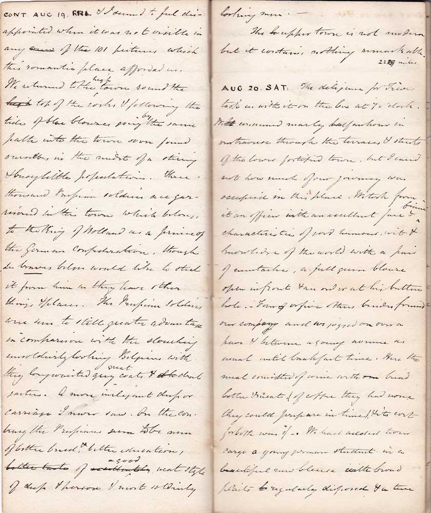 & I seemed to feel disappointed when it was not visible in any of the 101 pictures which this romantic place afforded us. We returned to the high town round the top of the rocks & following the tide of blue blouses going by the same path into the town soon found ourselves in the midst of a stirring & busy little population. Three thousand Prussian soldiers are garrisoned in this town which belongs to the King of Holland as a prince of the German confederation, though Les braves Belges would like to steal it from him as they have other things & places. The Prussian soldiers were seen to still greater advantage in comparison with the slouching unsoldierly looking Belgians with their longwaisted grey greatcoats & drab garters. A more inelegant dress or carriage I never saw. On the contrary the Prussians seemed to be men of better breed & better education, of good neat style of dress & person & most soldierly looking men. -