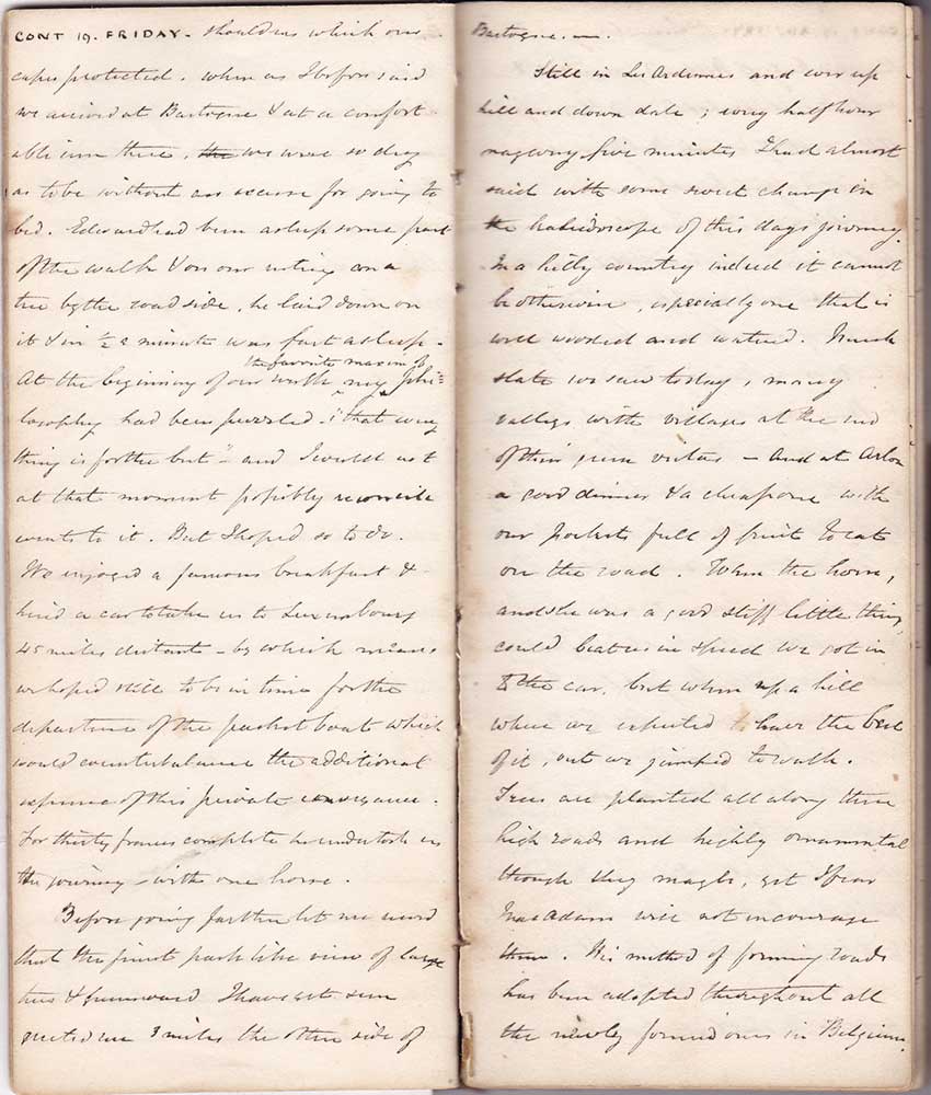 Still in Les Ardennes and ever up hill and down dale; every half hour nay every five minutes I had almost said with some sweet change in the kaleidoscope of this day's journey. In a hilly country indeed it cannot be otherwise, especially one that is wooded and watered. Much slate we saw today, many valleys with villages at the end of their green vistas - and at Arlon a good dinner & a cheap one with our pockets full of fruit to eat on the road. When the horse, and she was a good stiff little thing, could beat us in speed we got in to the car but when up a hill where we expected to have the best of it, out we jumped to walk. Trees are planted all along these high roads and highly ornamental though they may be, yet I fear MacAdam will not encourage them. His method of forming roads has been adopted throughout all the newly formed ones in Belgium
