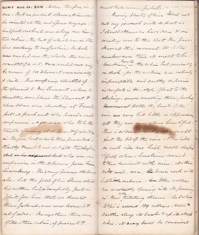 2 days therefore in one. But no, general observations can be inserted at the end of our voyage. And first our boat was a long one having two cabins, the best of which was in the bow contrary to our fashion. The deck reached over the whole the crew consisted of 4 or 5 & we wended our way by means of 1 or 2 horses & occasionally a sail. Our company consisted of the aforesaid 5. Mrs Tennant whose two daughters were plain tho' pleasant & whose two sons were educating at Frankfurt; - a French gent who proved a good companion - a German who took the trouble of carving at dinner & of assisting in the fun & wit which there prevailed, & lastly & much to our delight the chasseur vert who was our companion in the diligence from Luxembourg. The young German student also, but the folds of his blouse which his mother had so carefully put in plaits for him that we thought them fastened, were now loosened & out of order. Many others there were of the other cabin of peasants & small tradesmen perhaps.