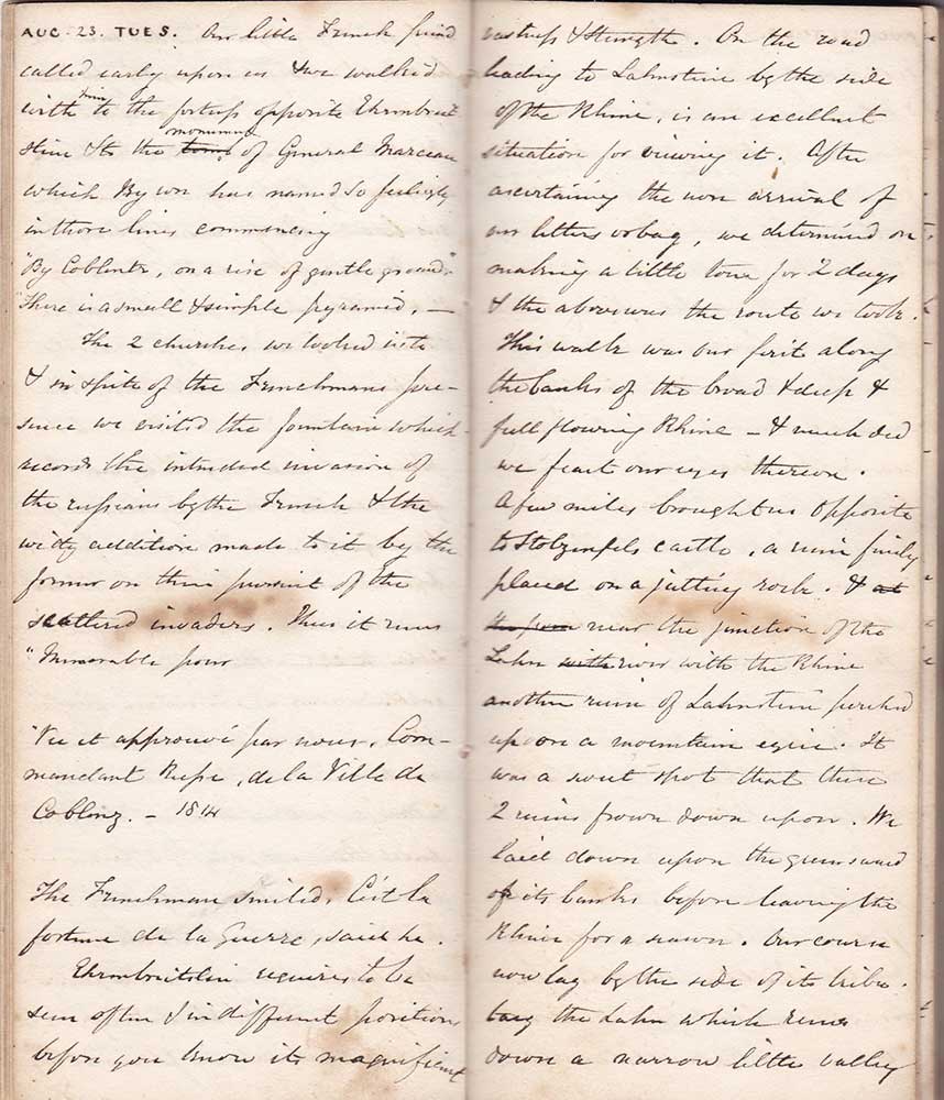 Our little French friend called early upon us & we walked with him to the fortress opposite Ehrenbreitstein & to the monument of General Marceau which Byron has named so feelingly in these lines commencing