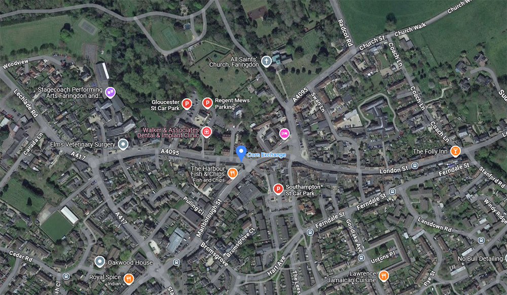 The venue is located in the heart of the town, with parking close by and good access to bus networks (S6 between Oxford and Swindon; 67 and 68 between Wantage and Faringdon) Faringdon is just off the A420, with the A4095 leading out towards Witney and Bampton, and the A417 out towards Lechlade and Burford.