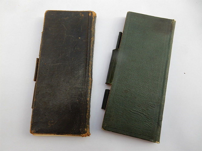 Both notebooks are 7ins by 3ins containing approximately 160 pages each with 24 lines. The hard covers have one loop in the middle on one side and two on the other side for secure closure by a pen through all three loops.