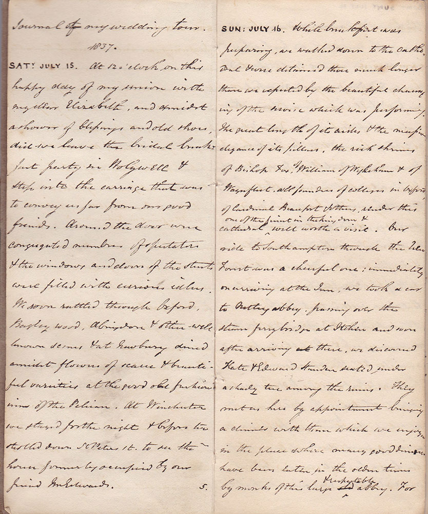 SAT JULY 15. At 12 o'clock on this happy day of my union with my dear Elizabeth, and amidst a shower of blessings and old shoes, did we leave the bridal breakfast party in Holywell & step into the carriage that was to convey us far from our good friends. Around the door were congregated numbers of spectators & the windows and doors of the streets were filled with curious idlers. We soon rattled through Oxford, Bagley Wood, Abingdon & other well-known scenes & at Newbury dined amidst flowers of scarce & beautiful varieties at the good old fashioned inn of the Pelican. At Winchester we stayed for the night & before tea strolled down St Peter's St. to see the house formerly occupied by our friend Mr Edwards. 5