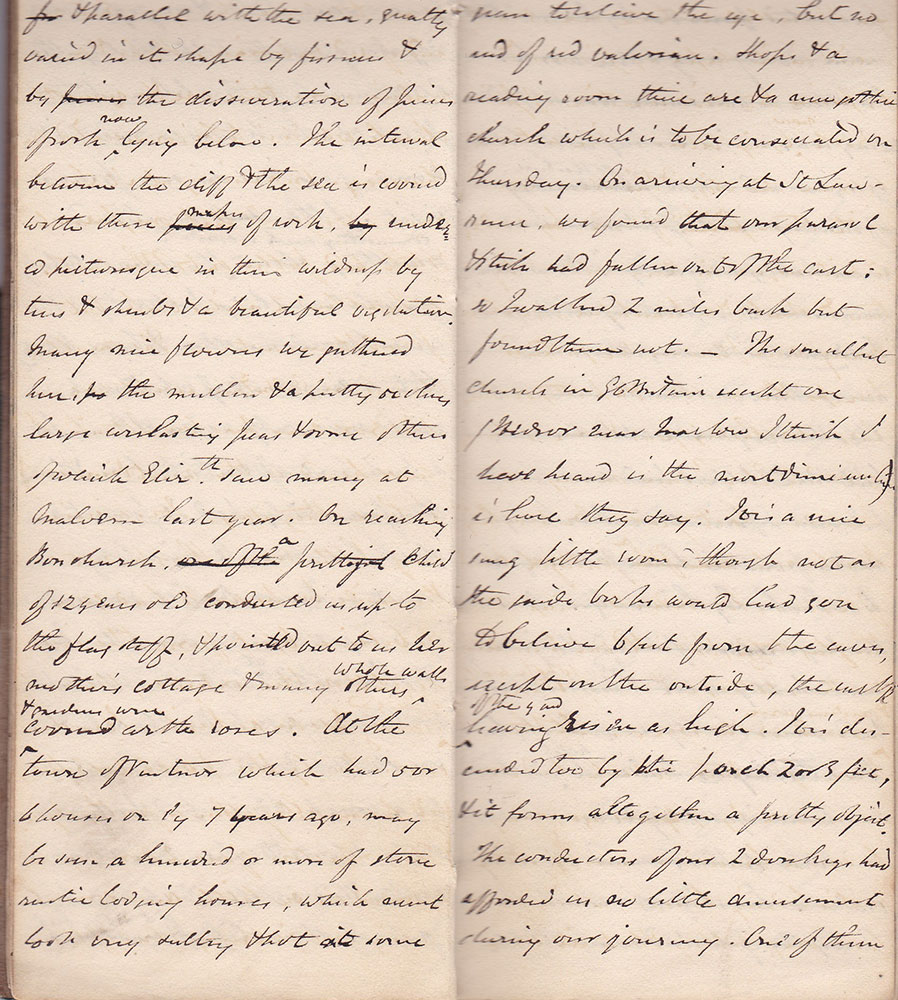 in height rising perpendicularly & parallel with the sea, greatly varied in its shape by fissures & by the disseveration of pieces of rock now lying below. The interval between the cliff & the sea is covered with these masses of rock rendered picturesque in this wildness by trees & shrubs & a beautiful vegetation. Many nice flowers we gathered here, the mullein & a pretty orchis large everlasting peas & some others of which Elizth saw many at Malvern last year. On reaching Bonchurch a pretty child of 12 years old conducted us up to the flagstaff, & pointed out to us her mother’s cottage & many others whose walls & gardens were covered with roses. At the town of Ventnor which had 5 or 6 houses only 7 years ago may be seen a hundred or more of stone rustic lodging houses, which anent look very sultry & hot at some period of the year, for there is little green to relieve the eye, but no end of red valerian. Shops & a reading room there are & the new gothic church which is to be consecrated on Thursday. On arriving at St Lawrence, we found that our parasol & stick had fallen out of the cart; so I walked 2 miles back but found them not. - The smallest church in Gt Britain except one (Hedsor near Marlow I think I have heard is the most diminutive) is here they say. It is a nice snug little room, though not as the guidebooks would lead you to believe 6 feet from the eaves, except on the outside, the [ ] off the ground having risen as high. It is descended too by the porch 2 or 3 feet, & it forms altogether a pretty object. The conductors of our 2 donkeys had afforded us no little amusement during our journey. One of them