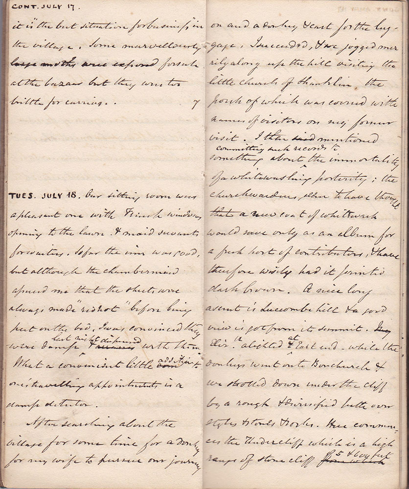 TUES July 18. Our sitting room was a pleasant one with French windows opening to the lawn & maid servants for waiters. So far the inn was good, but although the chambermaid assured me that the sheets were always made "red hot" before being put on the bed, I was convinced they were damp last night & ?disputed with them. What a convenient little addition to one’s travelling appointments is a damp detector.