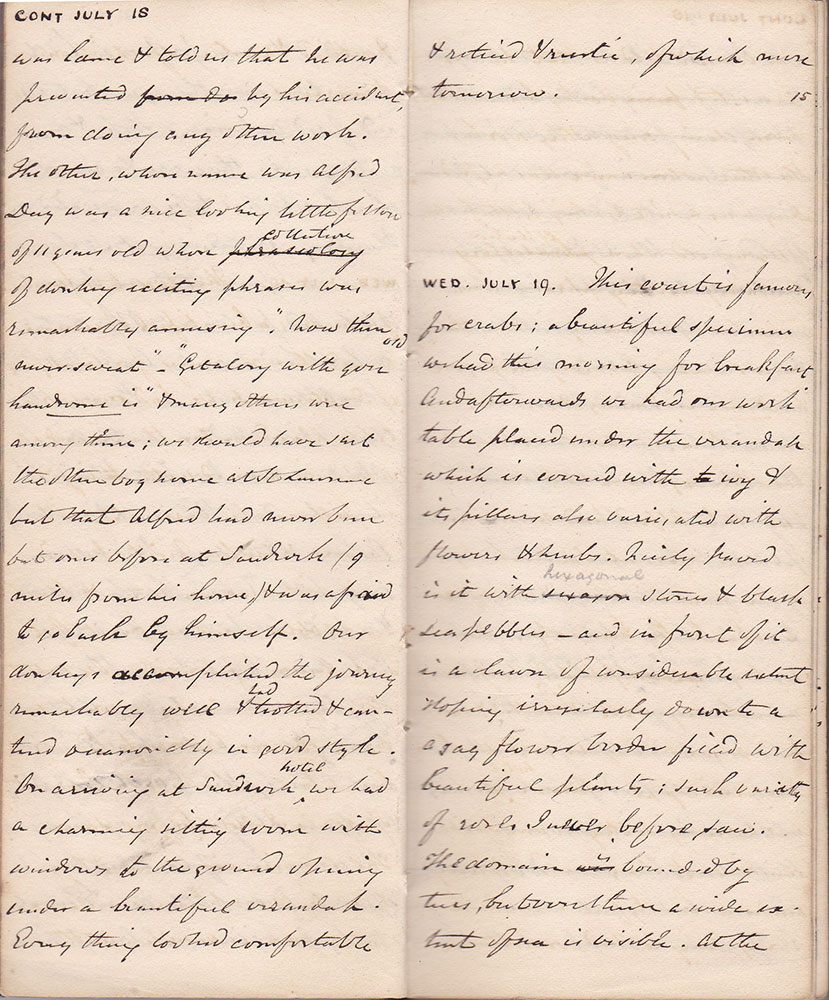 WED. JULY 19. This coast is famous for crabs; a beautiful specimen we had this morning for breakfast. And afterwards we had our work table placed under the verandah which is covered with ivy & its pillars also variegated with flowers & shrubs. Nicely paved is it with hexagonal stones & black sea pebbles and in front of it is a lawn of considerable extent sloping irregularly down to a gay flower border filled with beautiful plants; such variety of sorts I never before saw. The domain is bounded by trees, between them a wide extent of sea is visible. At the