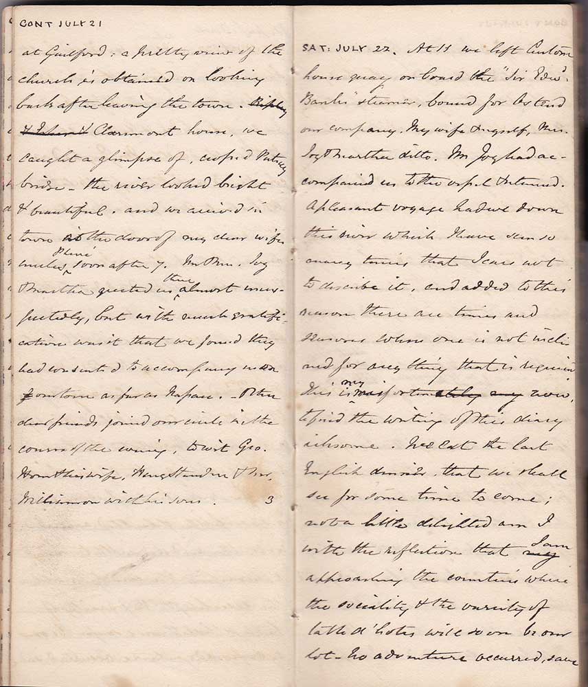 SAT: JULY 22. At 11, we left Customs house quay on board the “Sir Edwd Banks” steamer, bound for Ostend our company, my wife & myself, Mrs Joy & Martha ditto. Mr Joy had accompanied us to the vessel & returned. A pleasant voyage had we down this river which I have seen so many times that I care not to describe it, and added to this reason there are times and seasons when one is not inclined for any thing that is required. This is my misfortune now, to find the writing of this diary irksome. We eat the last English dinner that we shall see for some time to come; not a little delighted am I with the reflection that I am approaching the countries where the sociality & the variety of the table d’hôtes will soon be our lot. No adventure occurred, save