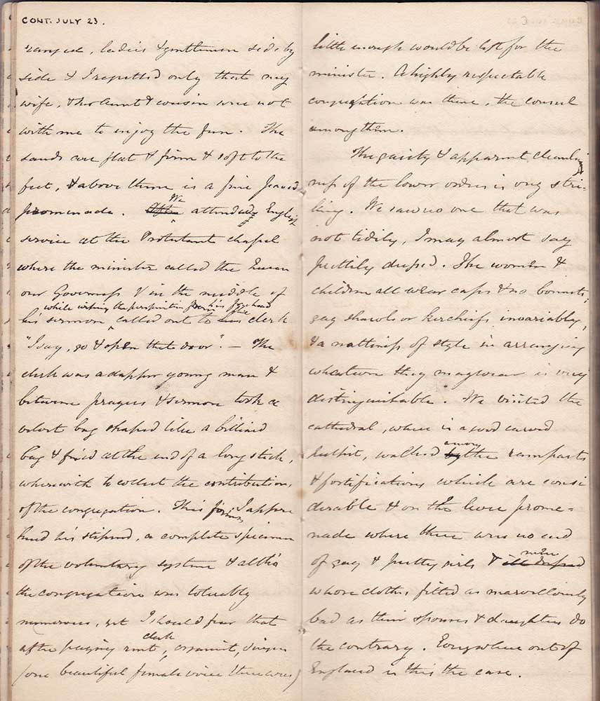 ranged, ladies & gentlemen side by side & I regretted only that my wife, & her aunt & cousin were not with me to enjoy the fun. The sands were flat & firm & soft to the feet, & above them is a fine paved promenade. We attended English service at the Protestant chapel where the minister called the Queen our Governess & in the middle of his sermon while wiping the perspiration from his forehead called out to the clerk “ I say, go & open that door.” - The clerk was a dapper young man & between prayers & sermon took a velvet bag shaped like a billiard bag & fixed at the end of a long stick, wherewith to collect the contributions of the congregation. This forms, I apprehend his stipend, a complete specimen of the voluntary system & although the congregation was tolerably numerous yet I should fear that after paying rent, clerk, organist, singers (one beautiful female voice there was) little enough would be left for the minister. A highly respectable congregation was there, the consul among them.