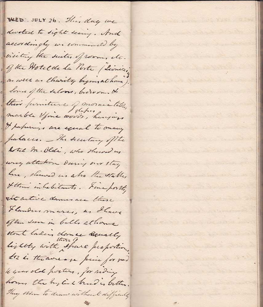 This day we devoted to sight seeing. And accordingly we commenced by visiting the suites of rooms etc. of the Hotel de la Porte (“Lionizing as well as Charity begins at home”). Some of the salons, bedrooms & their furniture of mosaic tables marble & fine woods, glasses hangings & paperings are equal to many palaces. – The secretary of the hotel M. Oldi, who shewed us every attention during our stay here, shewed us also the stables & their inhabitants. Fine portly yet active dames are these Flanders mares, as I have often seen in balls at home stout ladies dance equally lightly with those of spare proportions. £12 is the average price for good 4 year old posters, for riding horses the English breed is better. They seem to draw without difficulty
