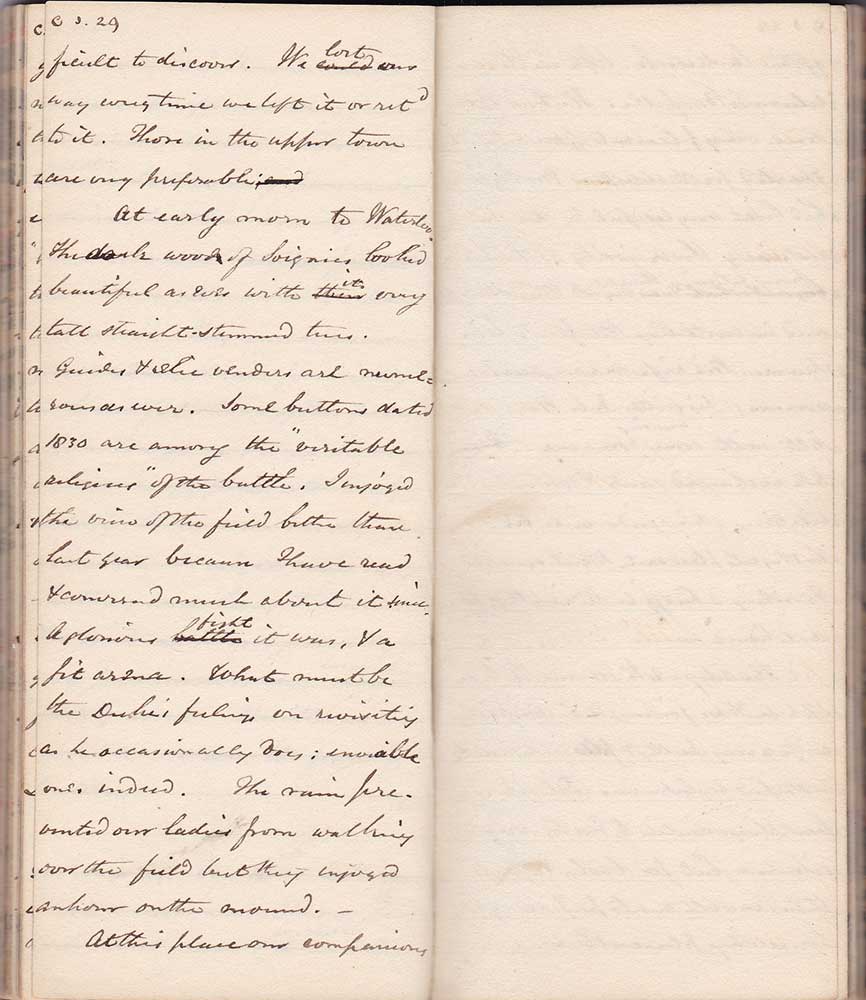 At early morn to Waterloo. The dark wood of Soignies looked beautiful as ever with its very tall straight-stemmed trees. Guides & relic vendors are numerous as ever. Some buttons dated 1830 are among the “veritable reliques” of the battle. I enjoyed the view of the field better than last year because I have read & conversed much about it since. A glorious fight it was, Va fit ardua. What must be the Duke’s feelings on revisiting as he occasionally does; enviable ones indeed. The rain prevented our ladies from walking over the field but they enjoyed an hour on the mound.