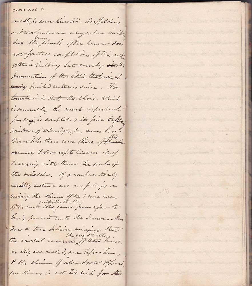 our steps were directed. Scaffolding and workmen are everywhere visible, but the busy clank of the hammer does not for foretell completion of this noble gothic building but merely the preservation of the little that was finished centuries since. Fortunate it is that the choir, which is generally the most important part is complete; its fine tapestry windows of coloured glass, more lanthorne-like than were those of Aix seeming to soar up to heaven itself & carrying with them the soul of the beholder. Of a comparatively earthly nature are our feelings on viewing the shrine of the 3 wise men of the east who guided by the star came from afar to bring presents unto the Saviour. How does a true believer imagine that the mortal remains the very skulls of these kings, as they are called, are before him, & the shrine of silver & gold & precious stones is not too rich for