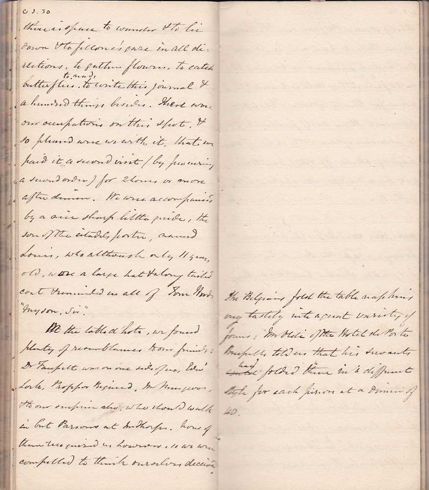 At the table d’hote, we found plenty of resemblances to our friends; Dr ?Fausselt was on one side of us, Edwd ?Lock, Professor ?Bigweed, Mr Musgrove, & to our surprise also who should walk in but Parsons at Mr Thorp’s. None of them recognised us however, so we were compelled to think ourselves deceived.