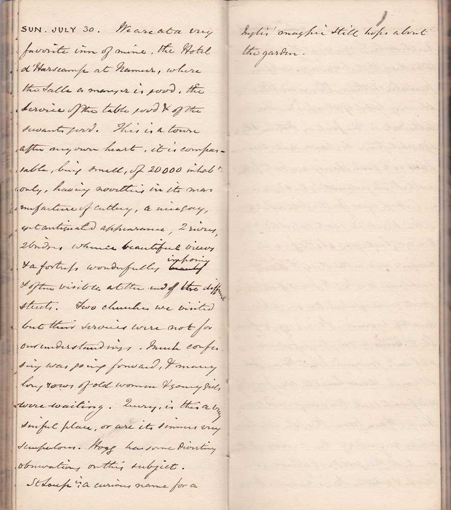 We are at a very favourite inn of mine, the Hotel d’Harscamp at Namur, where the Salle a manger is good, the service of the table is good & of the servants good.