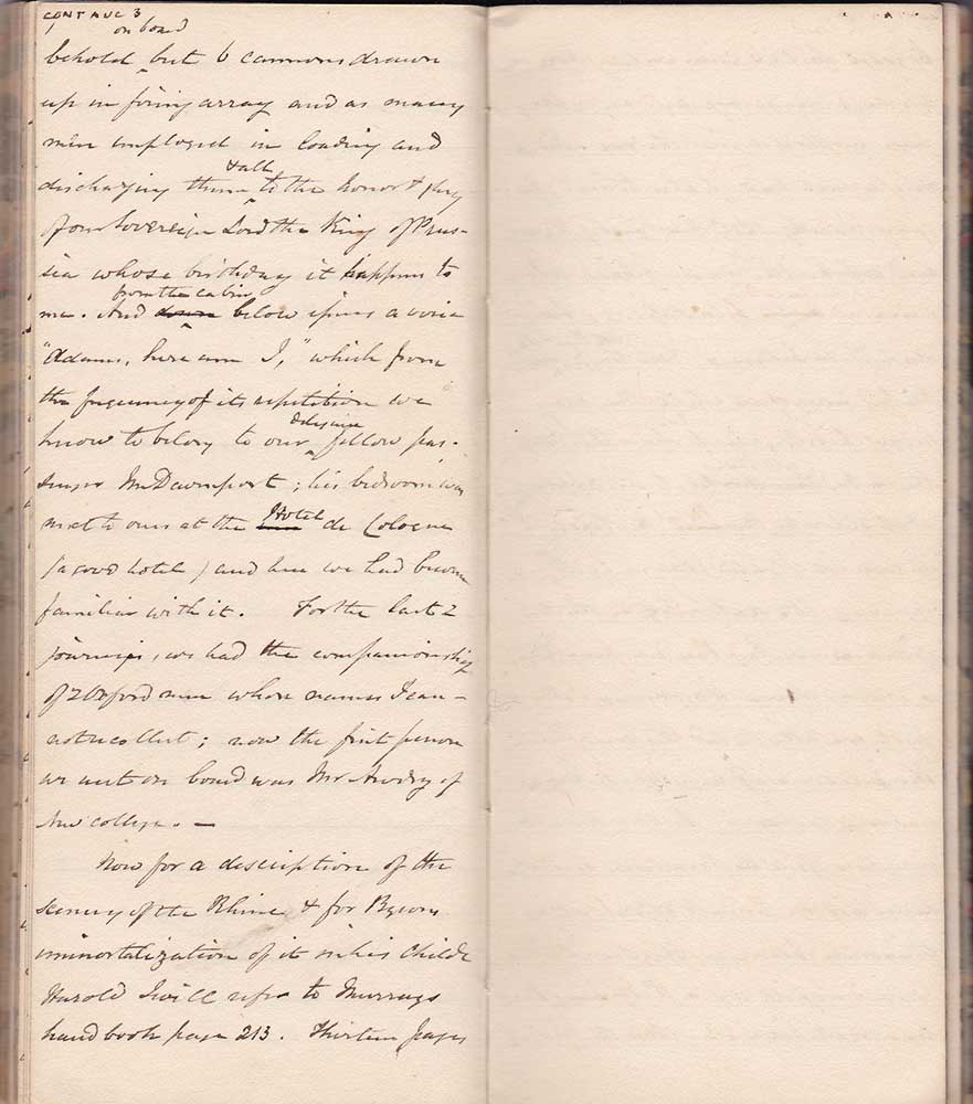 behold on board but 6 cannons drawn up in firing array and as many men employed in loading and discharging them & all to the honor & glory of our Sovereign Lord the King of Prussia whose birthday it happens to be. And from the cabin below issues a voice ‘Adams, here am I’ which from the frequency of its repetition we know to belong to our diligence fellow passenger Mr Davenport; his bedroom was next to ours at the Hotel de Cologne (a good hotel) and here we had become familiar with it. For the last 2 journeys, we had the companionship of 2 Oxford men whose names I cannot recollect; now the first person we met on board was Mr ?Avery of New College.