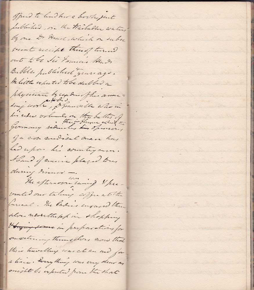 offered to lend her a book just published on the Wiesbaden waters by one Dr Head, which on subsequent receipt thereof turned out to be Sir Francis Head’s Bubbles published 4 years ago. He little expected to be dubbed a physician by readers of this amusing work nor did Dr Granville who in his ?new volumes on the baths of Germany [?ly] the influence which the opinions of a non medical man has had upon his countrymen. A band of musicians played to us during dinner. –