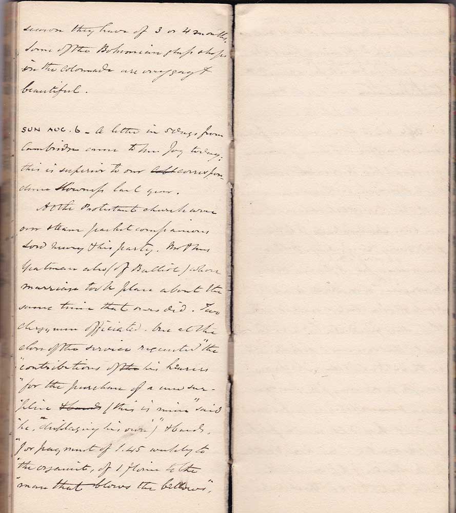 At the Protestant church were our steam packet companions Lord Newry & his party. Mr & Mrs ?Yeatman also (of Balliol) whose marriage took place about the same time as ours did. Two clergymen officiated. One at the close of the service requested “the contributions of his hearers for the purchase of a new surplice (this is mine said he, displaying his own) & bands, for payment of 1.45 weekly to the organist, of 1 florin to the man that blows the bellows,"