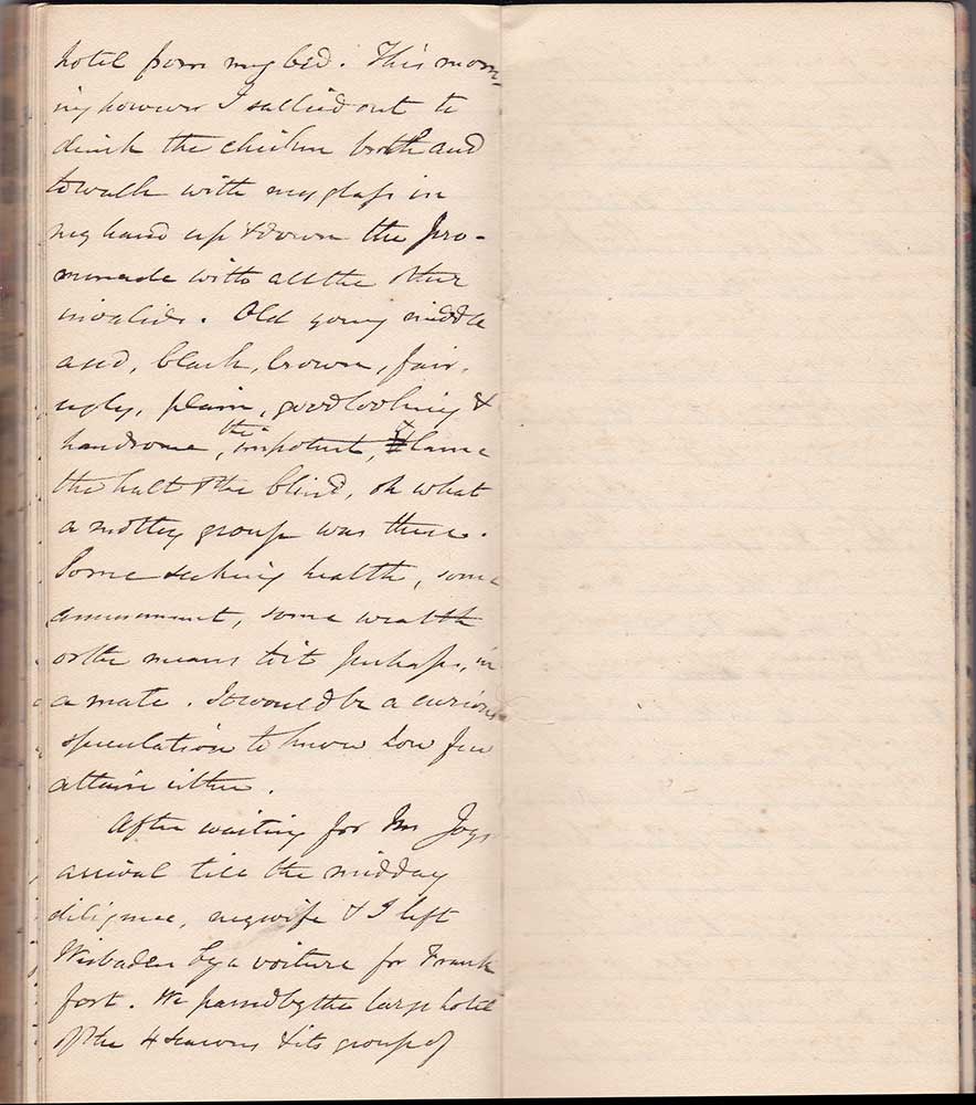 After waiting for Mr Joy’s arrival till the midday diligence, my wife & I left Wiesbaden by a voiture for Frankfort. We passed by the large hotel of the 4 seasons & its group of