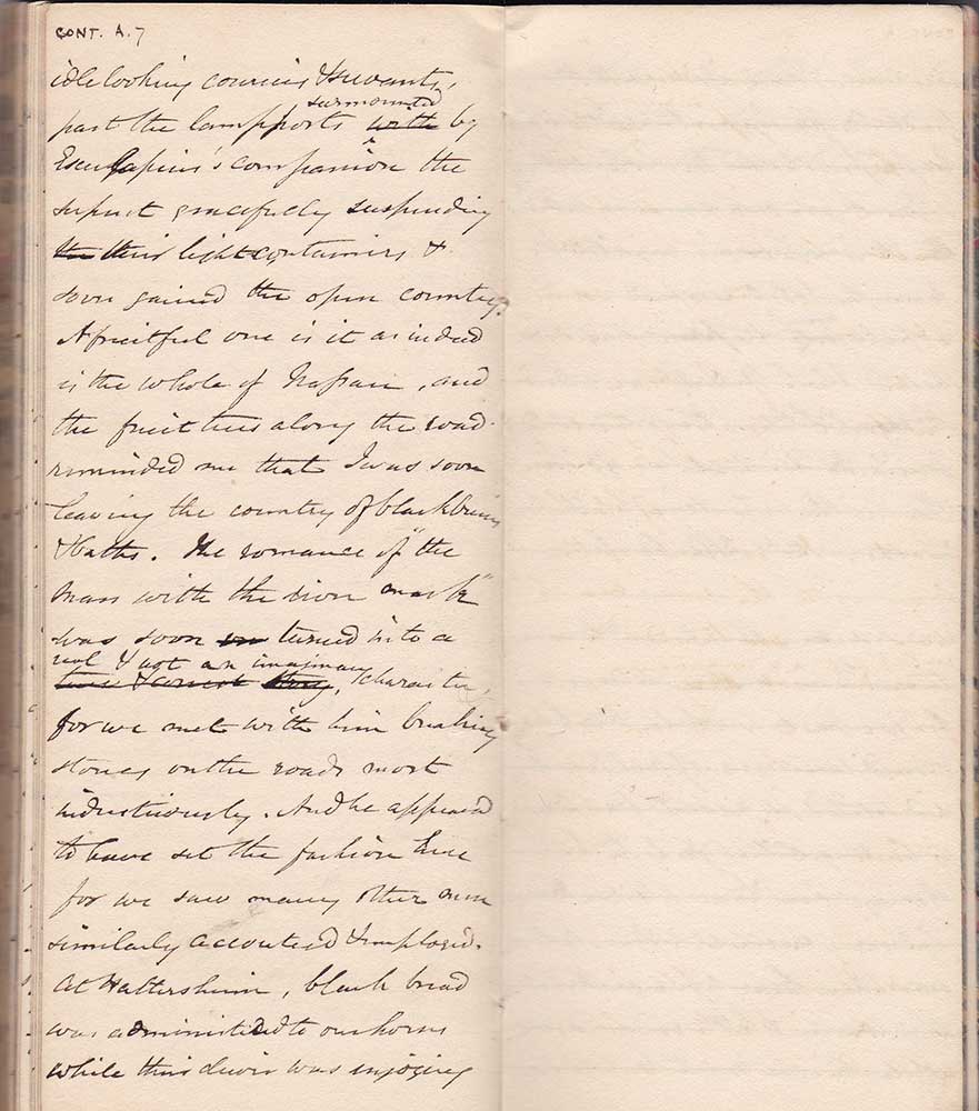 idle looking couriers & servants, past the lampposts surmounted by Esculepius's companion the serpent, gracefully suspending their light containers & soon gained the open country. A fruitful one is it as indeed is the whole of Nassau, and the fruit trees along the road reminded me that I was soon leaving the country of blackberries & baths. The romance of “the man with the iron mask” was soon turned into a real & not an imaginary character for we met with him breaking stones on the roads most industriously. And he appeared to have set the fashion here for we saw many other men accoutered & employed. At Hattersheim, black bread was administered to our horses while their driver was enjoying
