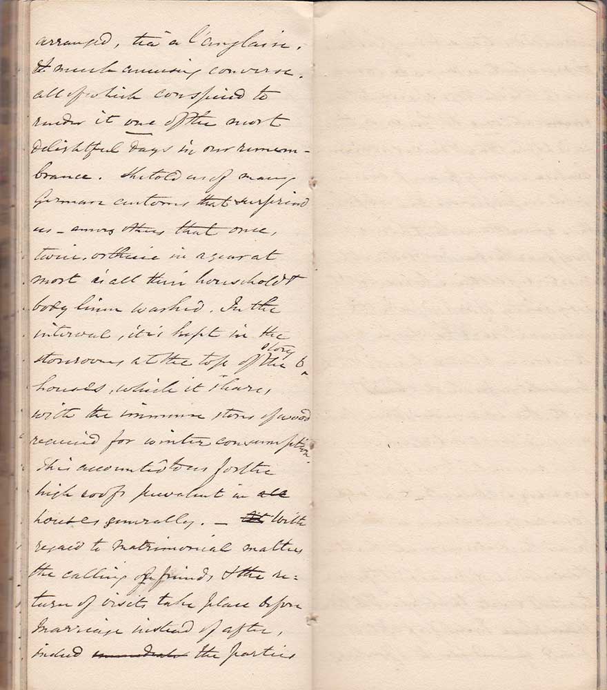 arranged, tea à l’anglaise, & much amusing conversation, all of which conspired to render it one of the most delightful days in our remembrance. She told us of many German customs that surprised us – among others that once, twice or thrice in a year at most is all their body linen washed. In the interval, it is kept in the storerooms at the top of the 6 story houses, which it shares with the immense stores of wood required for winter consumption. This accounted to us for the high roofs prevalent in houses generally. – With regard to matrimonial matters the calling of friends, & the return of visits take place before marriage instead of after, indeed the parties